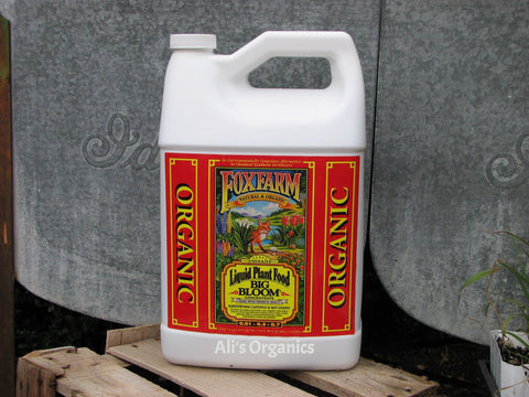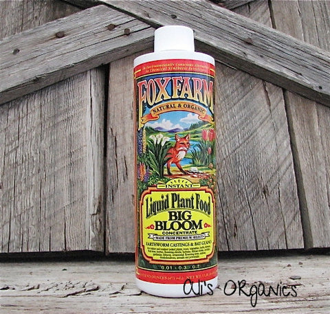 Fox Farms Organic Big Bloom Liquid Plant Food 0.01 - 0.3 - 0.7 is Excellent for houseplants and hydroponics! Works instantly on indoor and outdoor potted plants, roses, herbs, vegetables, berries, fruit trees, flowers, shrubs, orchids, gardenias, hibiscus, ornamentals, azaleas, rhododendrons, annuals and perennials. Derived from Earthworm castings, Bat Guano, Seabird Guano, Rock Phosphate, Sulfate of Potash, Magnesia and Norwegian Kelp. Big Bloom is a potent, fast acting source of nutrients for both plants and soil. General feeding - 4 Tablespoons per gallon of water once per week. 1 pint, 1 quart or 1 gallon concentrate.