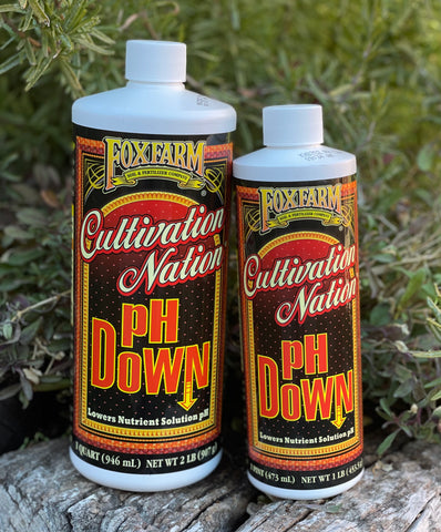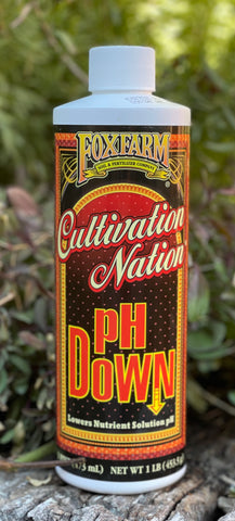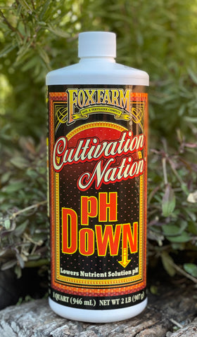 It's time to get down! Use Cultivation Nation pH Down to lower the pH of your nutrient solution in both soil and hydroponic environments. An ideal pH range for growing plants is 5.6 - 6.8. Take a pH reading of the nutrient solution. Based on your pH reading, adjust the pH by adding small amounts of pH down  to a time, testing for pH again after each application. Continue until the desired pH is reached. Only add pH down to water or nutrient solution. Do not use with products that are incompatible with acids, including thiosulfate fertilizers. Comes in 1 pt or 1 qt.