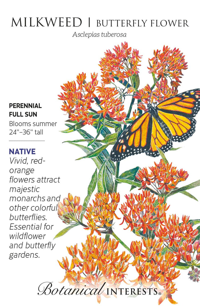 Butterfly Milkweed is a profusion of fiery, red-orange flower followed by decorative green seed pods in the beginning of summer. Drought tolerant once established; performs in poor soils. Butterflies will seed out your garden when you grow this vigorous, heirloom perennial, a preferred nectar plant for monarchs and other pollinators. Deer resistant. Cautions should be taken: The milky sap is poisonous if ingested in large quantities and contact with the skin may cause dermatitis in sensitive individuals.
