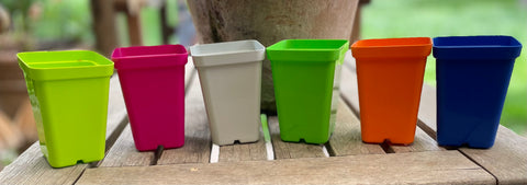 Sunpack Plastic square pots are high quality construction, thicker plastic than most nursery pots will last for years of use. Drainage holes in the bottom for healthier plants and root development. Ideal for starting your own herbs, flowers and vegetables at home. For ease of handling use with trays. Comes in two different sizes 2.5" or 3.3". Each size comes in 5 packs. 2.5" comes in six different colors, bright green, blue, orange, magenta, yellow, or lime green. 2.5" also comes in a mixed color 6 pack which includeds white, bright green, lime green, blue, orange, and magenta. 3.3" comes in bright green or blue.