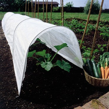 Fleece Grow Tunnel gives you a jump start in your early spring growing or late fall for protecting crops from the cold frost. Also works great for keeping garden pests out. Tough wire frame and fleece cover with easy access lift-up sides with elastic end closure with ground pegs for security. Comes in two different brands, the Gardman fleece measures 10 foot long by 18 inches high and the Bosmere fleece measures 118" L x 17.75" W x 17.75" H