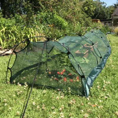 Make the utmost of the growing season in your garden with the Gardman Polyethylene grow tunnel. This durable plastic tunnel easily stretches over your new crops, and is designed to retain heat in the soil and air around your plants, for a miniature greenhouse in you yard. Place the legs of each arch in the ground and stretch the netting over your planted row, up to 10 feet long. The elastic ends and lifting sides of moisture in for sustained growth. Has UV stable polytene sheeting. Protects plants from frost and extends the growing season so that gardeners can start their vegetable gardens earlier than their neighbors and extend their harvest. Comes in two different brands, the Bosmere poly 118" L x 17.75" W x 17.75" H and the Gardmen Poly measures 10' foot by 18 inches high.